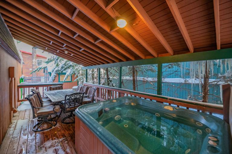 OUTDOORS - 6 to 8 person hot tub, 8-person patio dining table/chairs, charcoal barbecue, wrap around porch, and fenced yard.