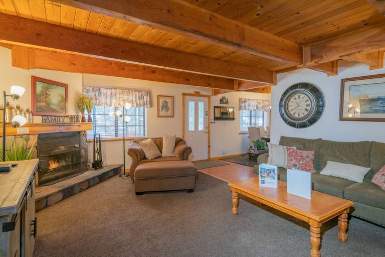 LIVING SPACE - Spacious 2000+ sq ft home with living room, ceiling fans, 8-person dining table, two beautiful wood burning fireplaces, and plenty of comfortable living room seating.