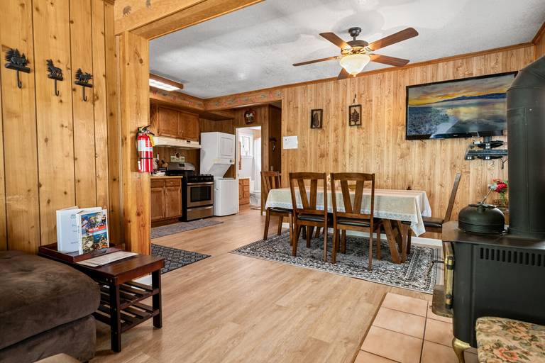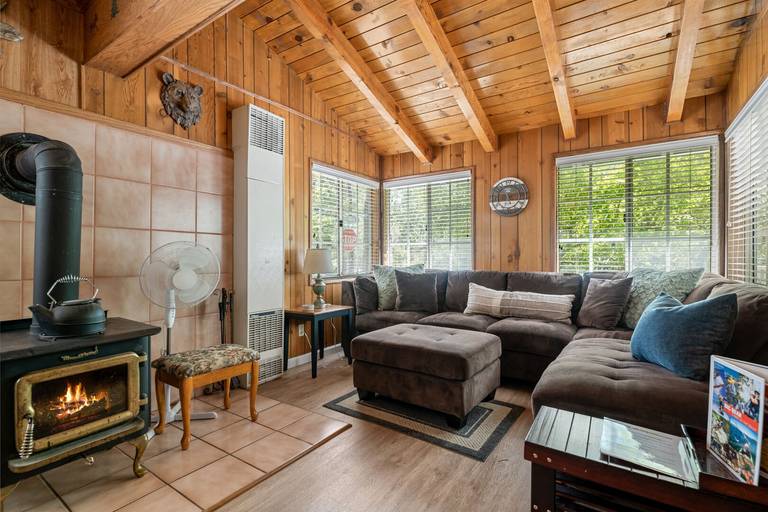 LIVING SPACE - Comfortable 800+ sq ft home with living room, ceiling fans, dining table, and a wood burning stove fireplace. Cuddle up on the sectional with plenty of comfortable living room seating.