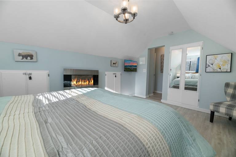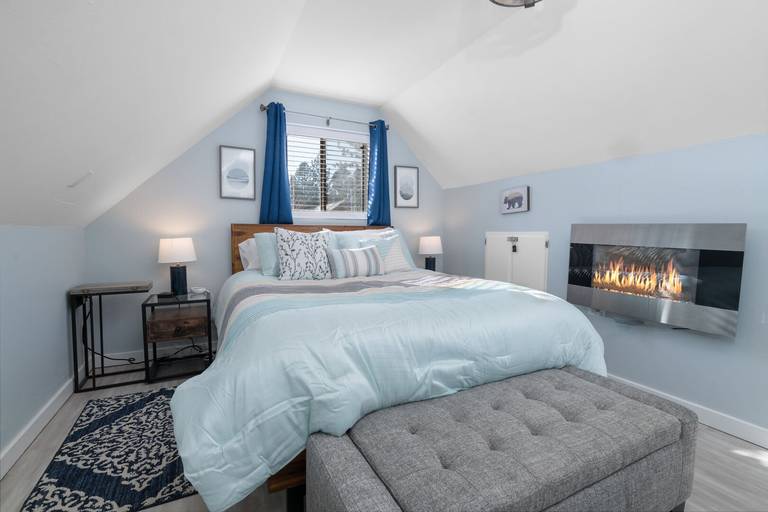 ROOMS & BEDS - 3 bedroom, 2 bath. Upstairs first bedroom has a king bed, smart TV, and electric fireplace. Upstairs second bedroom has a queen bed, smart TV, and electric fireplace. Downstairs fourth bedroom has a queen bed, smart TV, and electric fireplace. Upstairs bonus room has a queen bed, smart TV, and electric fireplace. Extra blankets and pillows are available.