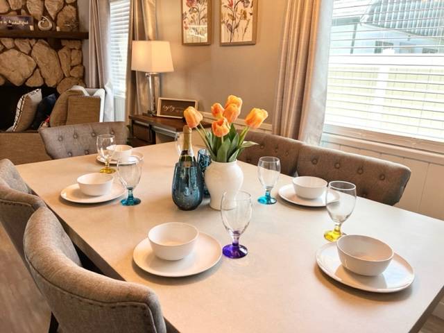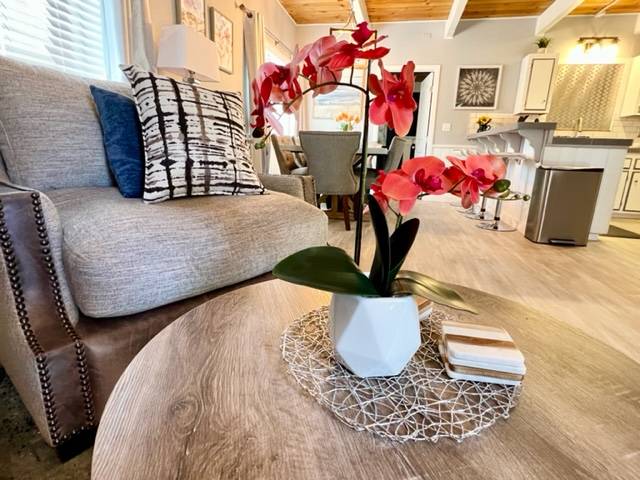 LIVING SPACE - Spacious 1,500+ sq ft home with living room, ceiling fans, dining table, bar seating, wood burning fireplace in the living room as well as an electric fireplace in the family room, and plenty of comfortable seating.