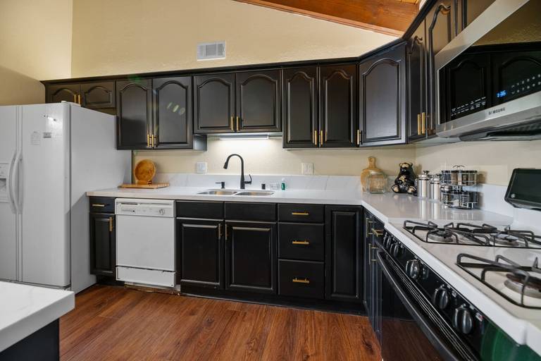 KITCHEN - Stove, oven, center island, double door refrigerator with water and ice dispenser, dishwasher, microwave, blender, toaster, Keurig coffee maker, crockpot, rice cooker, dishes, pots/pans, spices, and more.