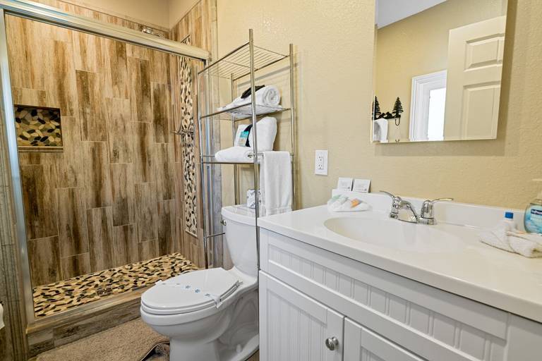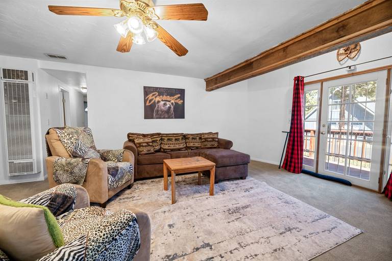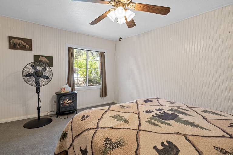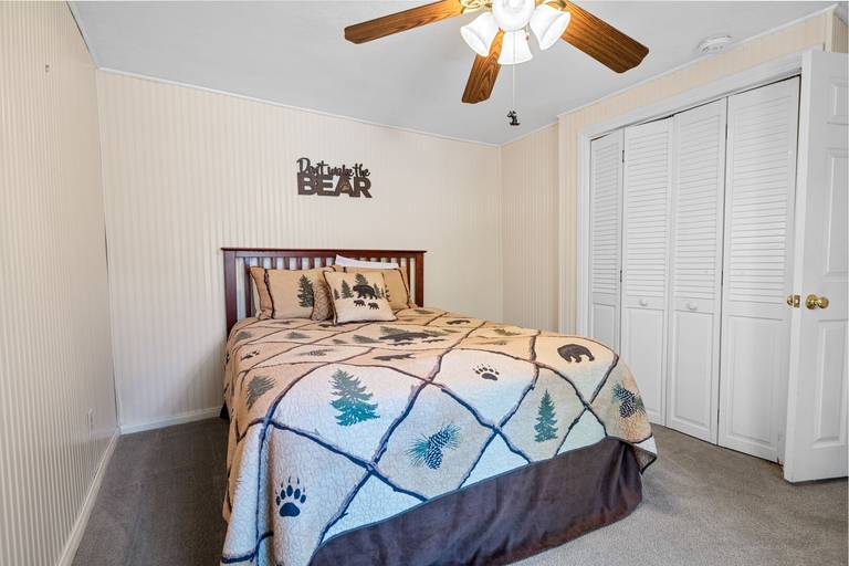 ROOMS & BEDS - 2 bedroom, 1.5 bath. First bedroom has a queen bed, ceiling fan, and electric fireplace. Second bedroom has a full/twin bunkbed. Living room has a sofa sleeper. Extra blankets and pillows are available.