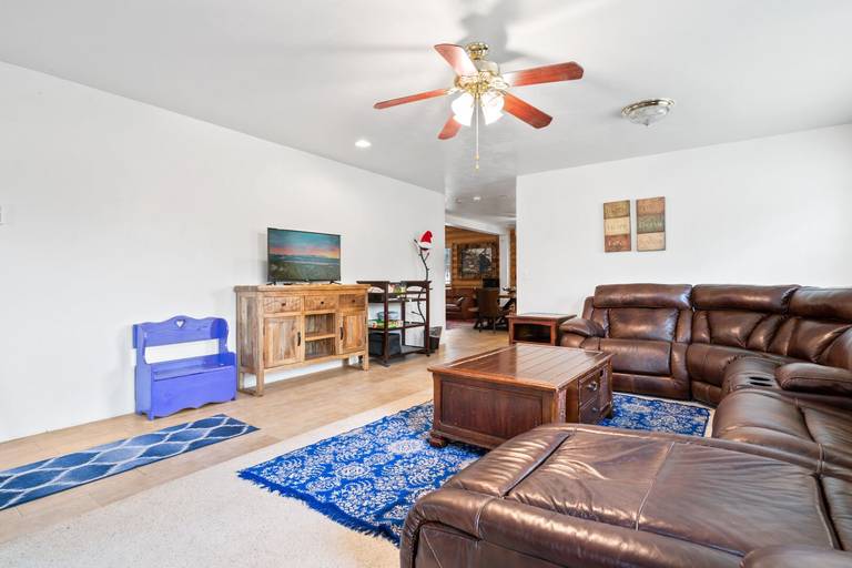 LIVING SPACE - Spacious 2200+ sq ft home with living room, family room, ceiling fans, dining table, bar seating, a beautiful gas fireplace, and plenty of comfortable living room seating.