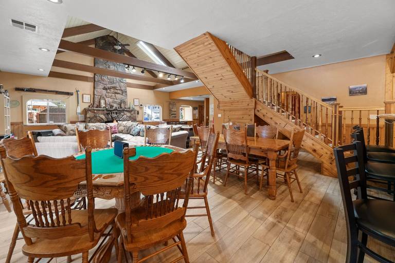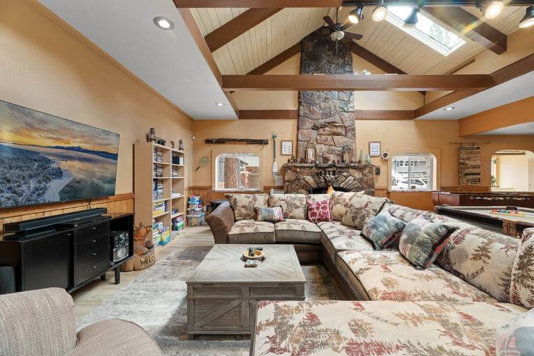 AMENITIES - Pool table, foosball table, bumper pool, poker table, and arcade game with Donkey Kong, Pac Man, and more. Smart TVs, streaming apps along with fast WiFi, a movie collection, board games and card games. Relax near the cozy wood burning fireplace. Laundry room with side-by-side washer/dryer.