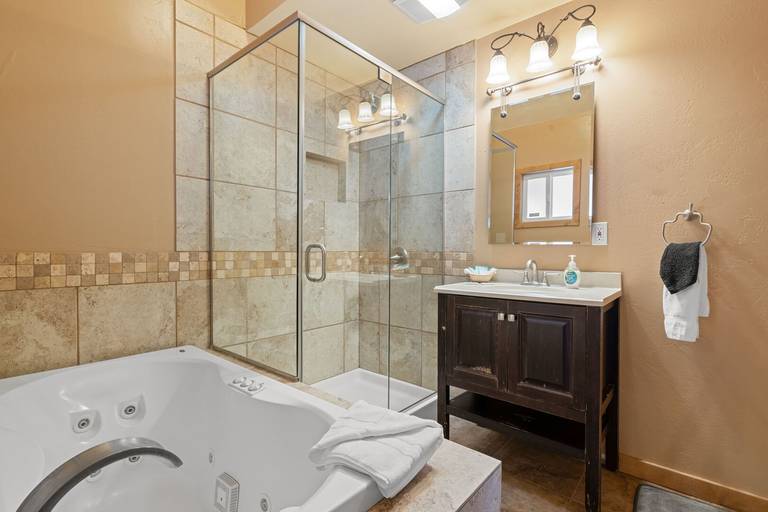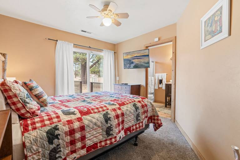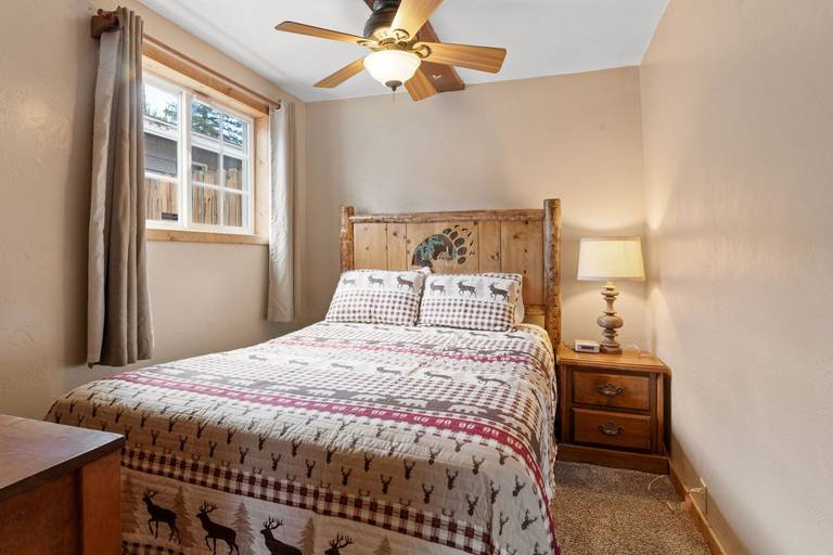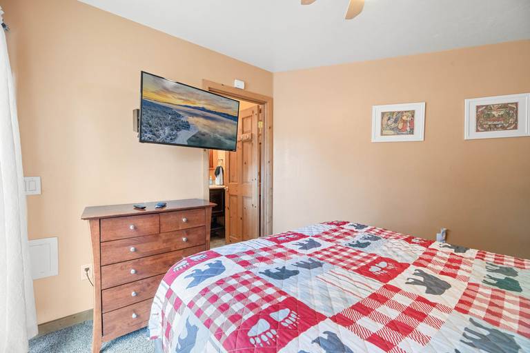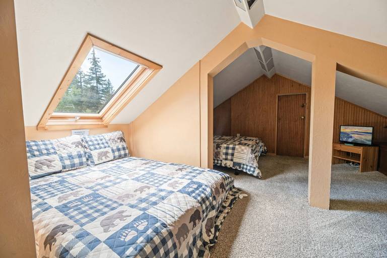ROOMS & BEDS - 4 bedroom, 3 bath. Downstairs master bedroom has a king bed, TV, private bath with jet tub, and deck. Downstairs second bedroom has a queen bed and TV. Downstairs third bedroom has a queen bed, TV, private bath, and deck. Downstairs fourth bedroom has queen/twin bunk beds, TV, and private bath. Upstairs loft has two queen beds and TV. Extra blankets and pillows are available.
