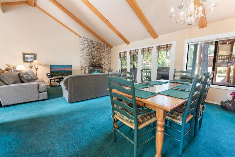 LIVING SPACE - Spacious 1400+ sq ft home with living room, dining table, a beautiful wood burning fireplace, and plenty of comfortable living room seating.