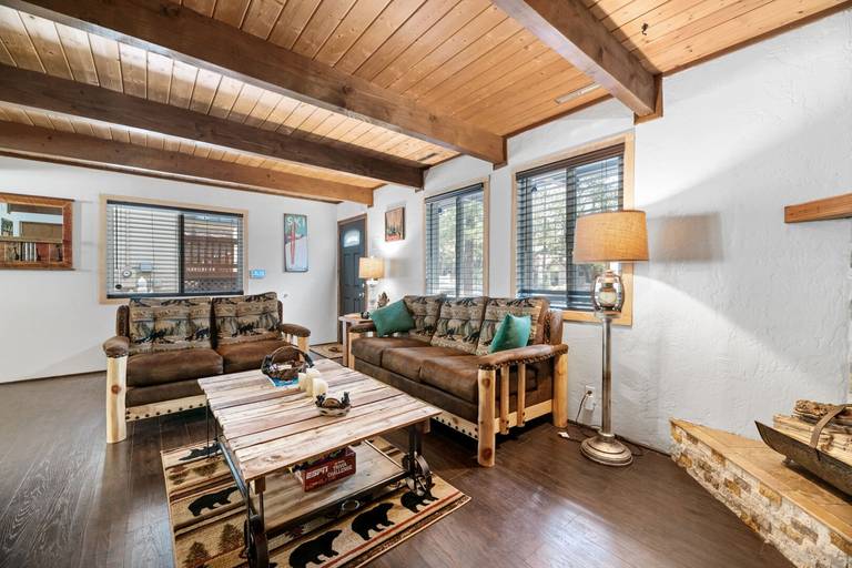 LIVING SPACE - Spacious 1300+ sq ft home with living room, game room with bar, dining table, bar seating, a beautiful wood burning fireplace, and plenty of comfortable living room seating.