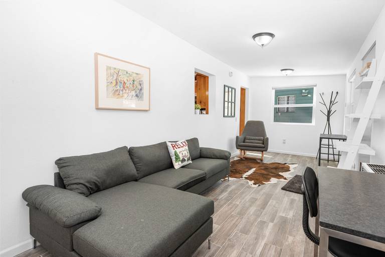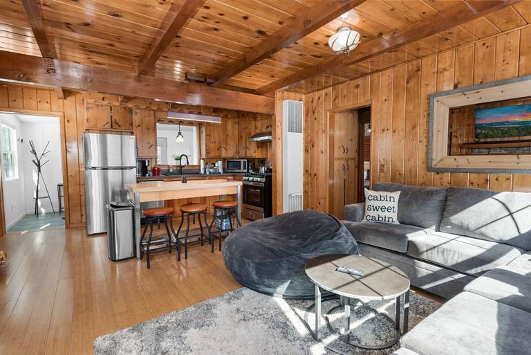 LIVING SPACE - Cozy 900+ sq ft home with living room, center island counter seating, a beautiful stone wood burning fireplace, and plenty of comfortable living room seating.