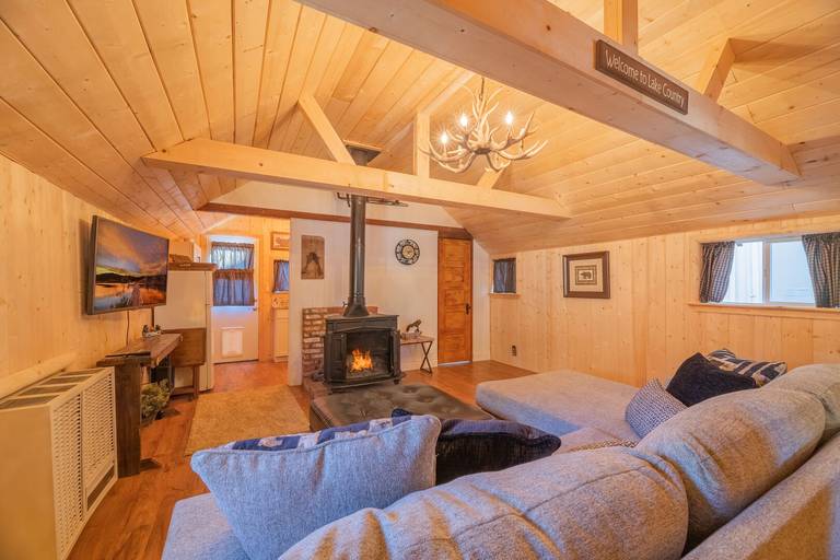LIVING SPACE - Cozy 380+ sq ft home with living room, a beautiful wood burning stove fireplace, and plenty of comfortable living room seating.