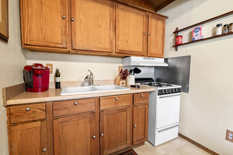 KITCHEN - Natural wood cabinets, stove with oven, refrigerator, microwave, blender, toaster, coffee maker, dishes, pots/pans, spices, and more.