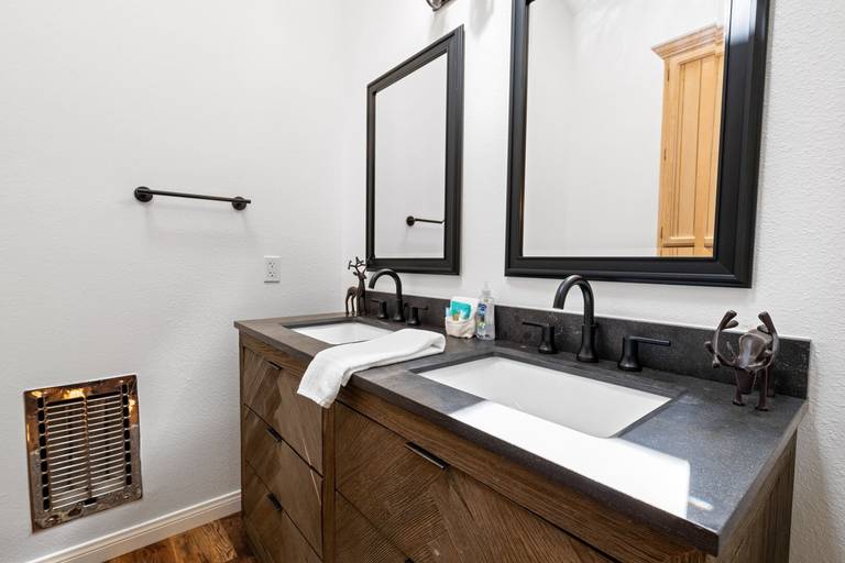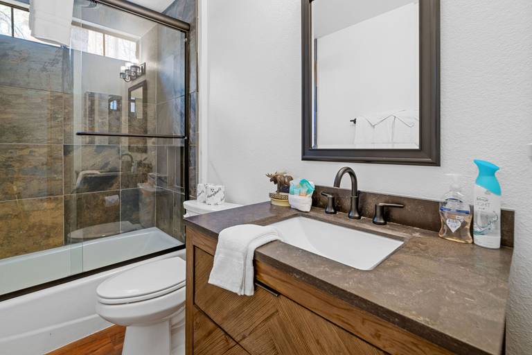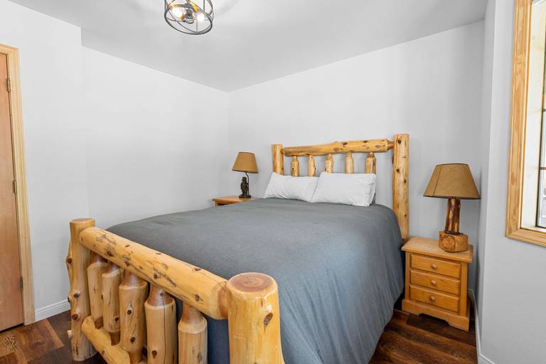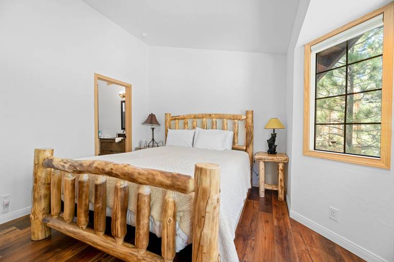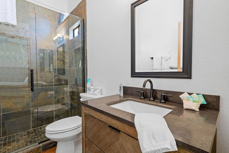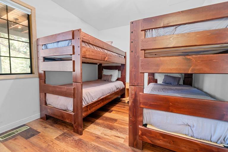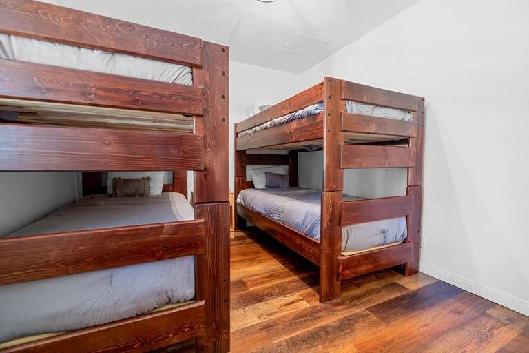 ROOMS & BEDS - 3 bedrooms and 2.5 baths. Upstairs master suite has a king bed and private bath. Downstairs second bedroom has a queen bed. Downstairs third bedroom has two twin/twin bunk beds.