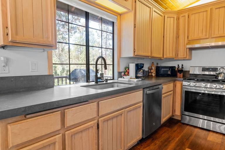 LIVING SPACE - With over 1600 sq ft of living space and a spacious open floor plan living area with vaulted ceilings, skylights, and picture windows allowing for plenty of natural light. Enjoy a wood-burning stove fireplace and comfortable seating throughout the living space.