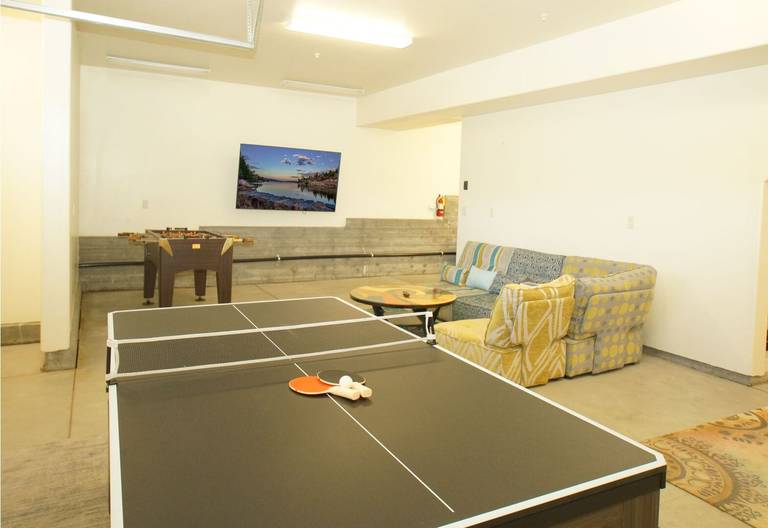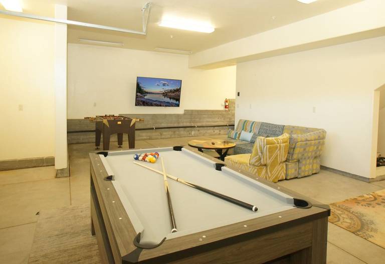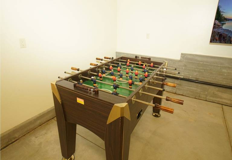 AMENITIES - For extra entertainment, our cabin boasts a fantastic game room where you can challenge each other to a round of foosball or other exciting games. Whether you're a competitive player or just looking for some lighthearted fun, the game room is sure to keep everyone entertained. In addition to the private spa, our cabin is equipped with modern amenities to ensure a comfortable stay. Stay cozy during the winter months with the provided heater. We also offer a laundry area with side-by-side washer/dryer for your convenience, allowing you to pack light and keep your clothes fresh throughout your stay.