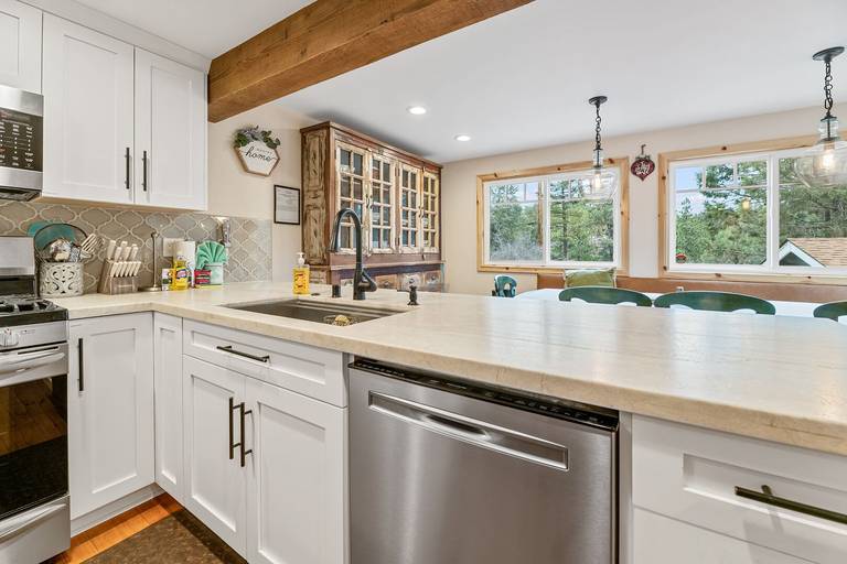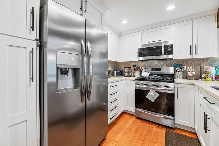 KITCHEN - Beautifully updated kitchen with leathered Taj Mahal quartz countertops, new cabinets, stainless steel appliances, freshened up the original wood floors. Stainless steel appliances, six burner stove with griddle, double door refrigerator with water and ice dispenser, dishwasher, microwave, blender, toaster, coffee maker, crockpot, rice cooker, dishes, pots/pans, spices, and more.