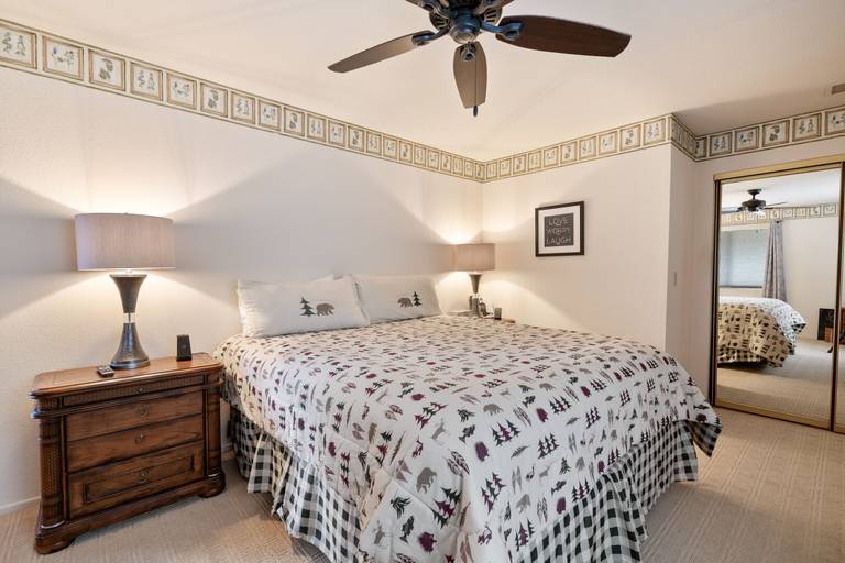 ROOMS & BEDS - 2 bedroom, 2 bath. Downstairs first bedroom has a king bed. Downstairs second bedroom has 2 double beds. Extra blankets and pillows are available.