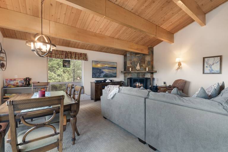 LIVING SPACE - Spread out in the spacious 1400+ sq ft home, featuring a welcoming living room, stylish dining table, a striking slate wood-burning fireplace, and ample comfortable seating for relaxation.
