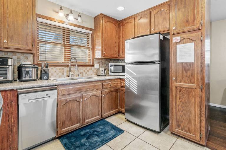 KITCHEN - Granite countertops, stainless steel appliances, stove, oven, refrigerator, dishwasher, microwave, blender, toaster, coffee maker, crockpot, rice cooker, dishes, pots/pans, spices, and more.