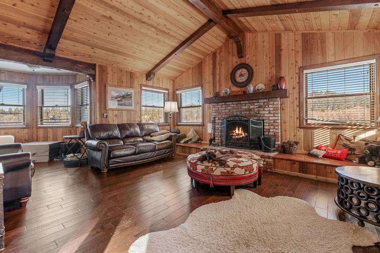 LIVING SPACE - This spacious 1722 sq ft home comes with a living room, dining table, a beautiful wood burning fireplace, and plenty of comfortable living room seating.