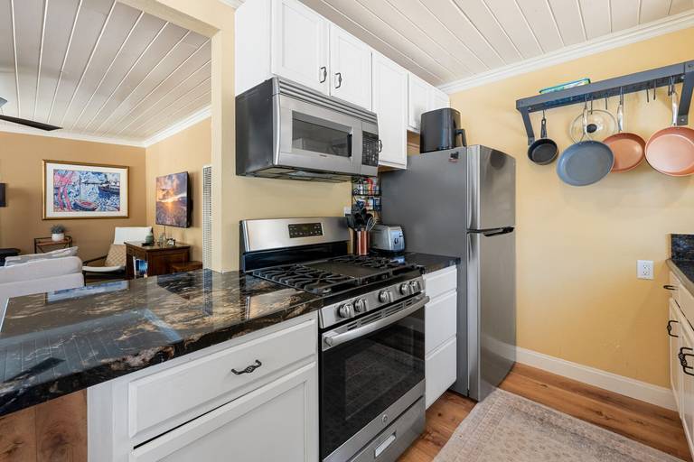 KITCHEN - Granite countertops, stainless steel appliances, stove/oven, refrigerator, dishwasher, microwave, blender, toaster, coffee maker, dishes, pots/pans, spices, and more.