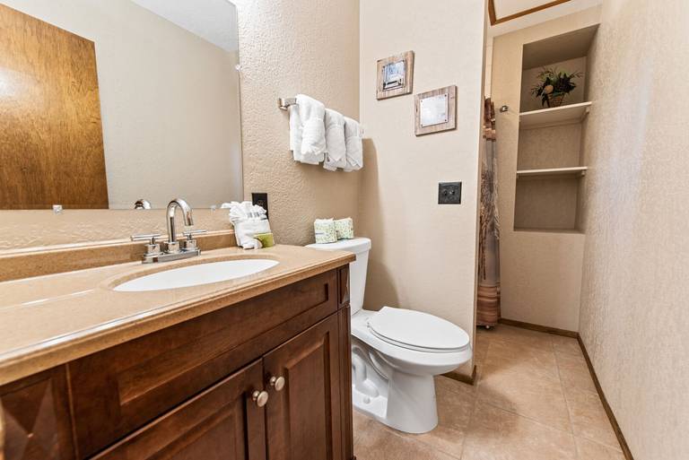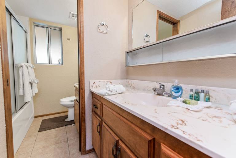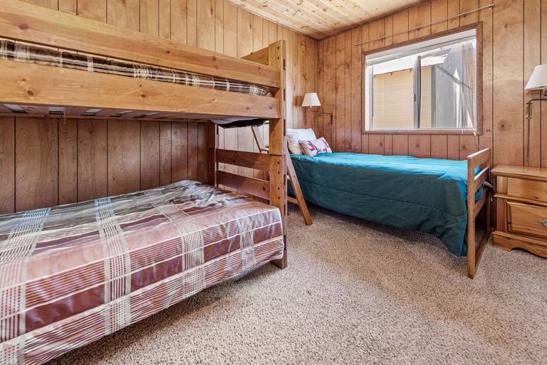 ROOMS & BEDS - Main house - 4 bedroom, 3 bath. Upstairs master bedroom has a king bed and private bath. Downstairs second bedroom has a queen bed. Downstairs third bedroom has a queen bed. Downstairs fourth bedroom has a double/twin bunk bed and twin bed. Guest house - 2 bedroom, 1 bath. Fifth bedroom has a queen bed. Sixth bedroom has a twin/twin bunk bed. Extra blankets and pillows are available.
