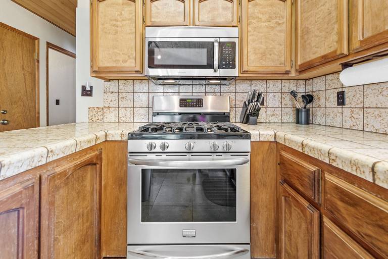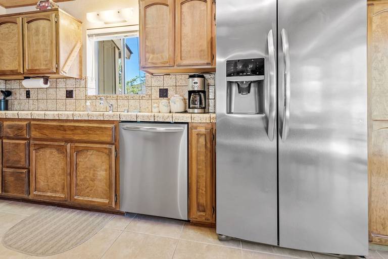 KITCHEN - Stainless steel appliances, granite countertops, stove with oven, double door refrigerator with ice maker and water dispenser, dishwasher, microwave, blender, toaster, coffee maker, dishes, pots/pans, spices, and more.