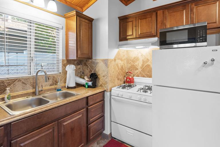 KITCHEN - Stove with oven, refrigerator, microwave, blender, toaster, dishes, pots/pans, and more.