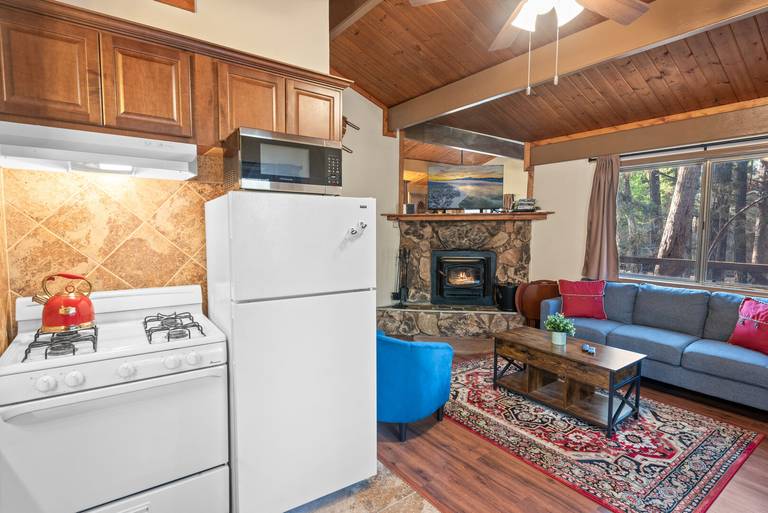 LIVING SPACE - Cozy 600+ sq ft home with living room, dining table, wood burning stove fireplace, and plenty of comfortable living room seating.