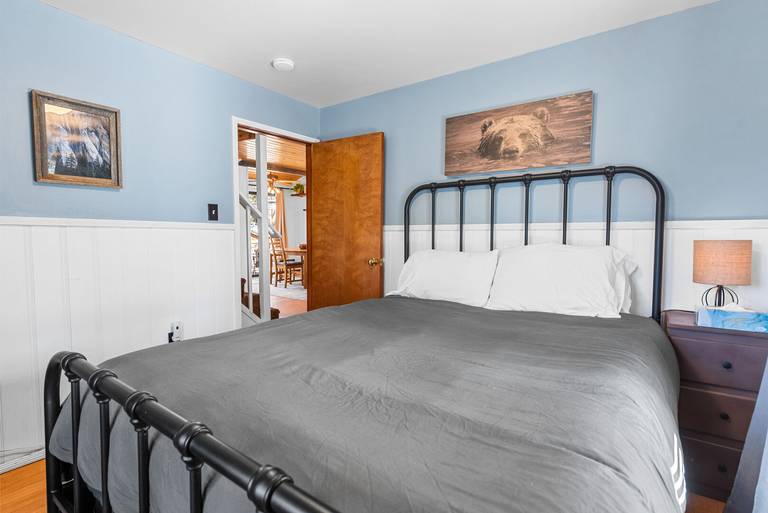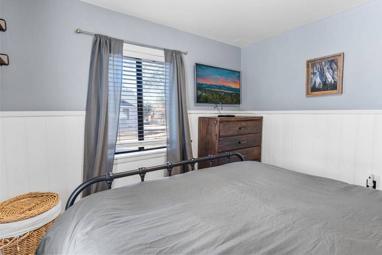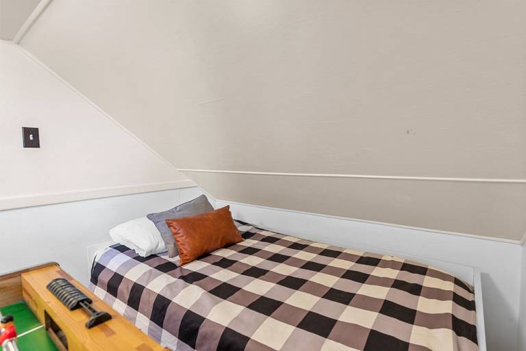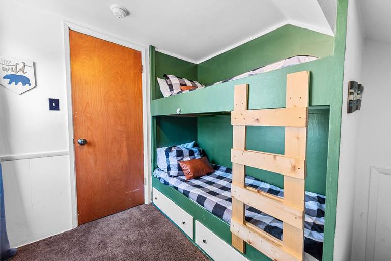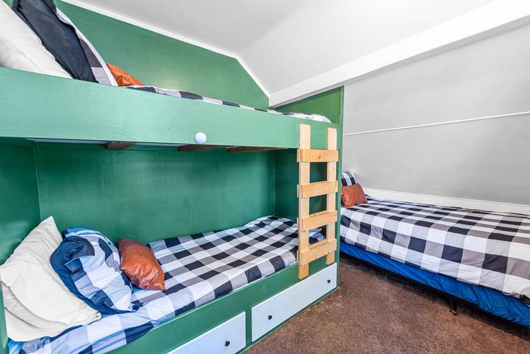 ROOMS & BEDS - 4 bedroom, 2 bath. Downstairs first bedroom has a queen bed and TV. Upstairs second bedroom has a twin/twin bunk bed and TV. Upstairs third bedroom has a queen bed and TV. Fourth bedroom has a twin bed, futon, foosball table, and TV. Extra blankets and pillows are available.