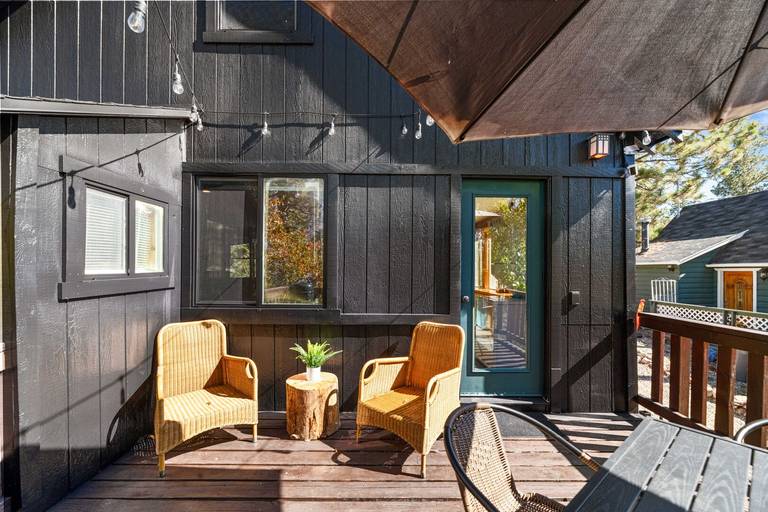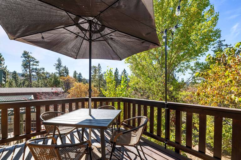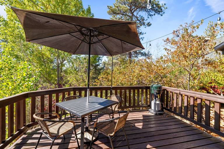 OUTDOORS - Back deck with patio table, umbrella, and plenty of patio seating. Enjoy sitting outside with string lighting and beautiful views.