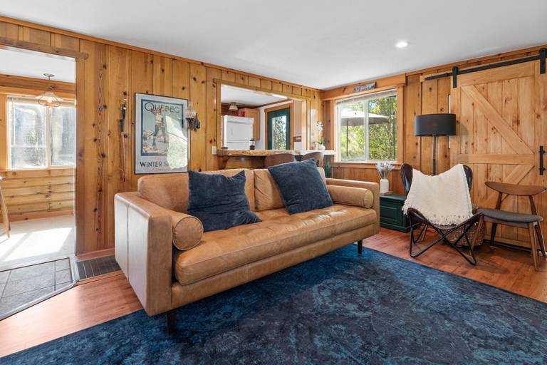 LIVING SPACE - Cozy 600+ sq ft home with living room, dining table, a beautiful wood burning fireplace, and comfy living room seating.
