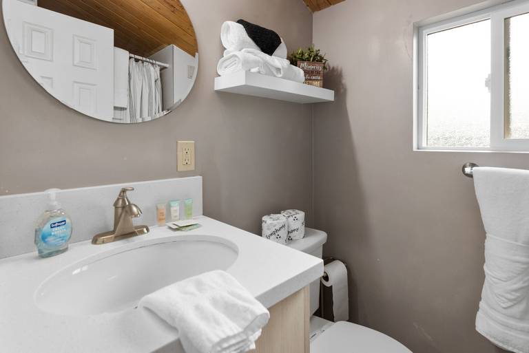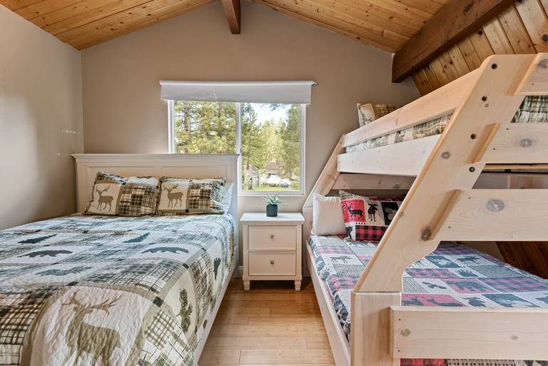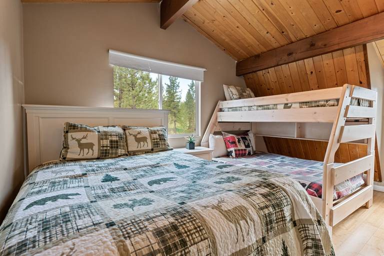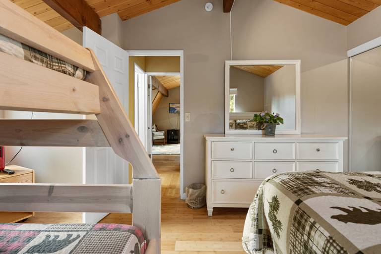 ROOMS & BEDS - 2 bedroom, 2 bath. Upstairs first bedroom has a king bed and balcony. Upstairs second bedroom has a queen bed and a twin/double bunk bed. Extra blankets and pillows are available.