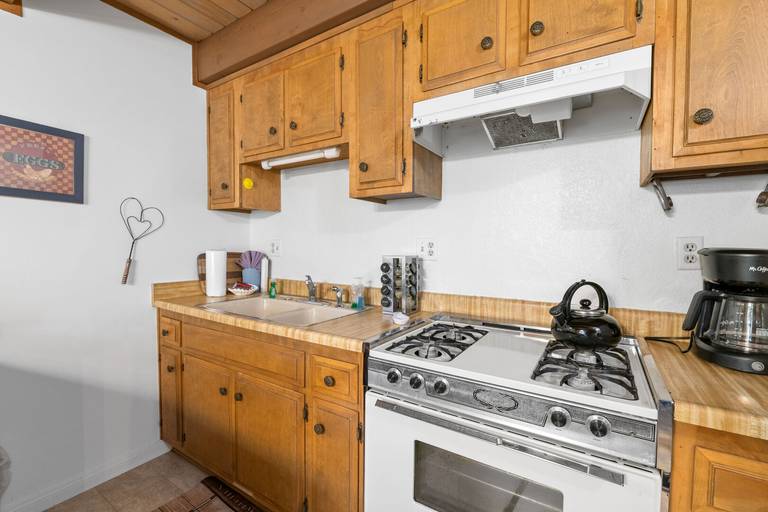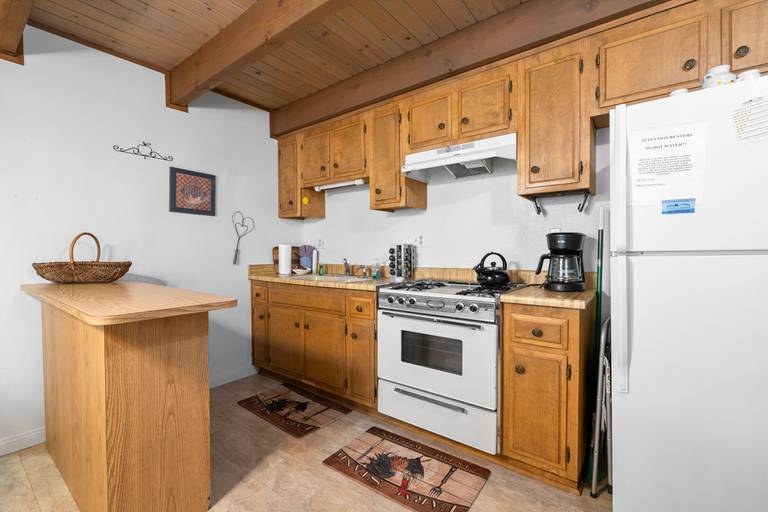 KITCHEN - Full kitchen with a stove/oven, refrigerator, microwave, blender, toaster, coffee maker, rice cooker, dishes, pots/pans, spices, and more.