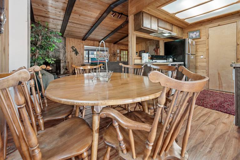 LIVING SPACE - Comfortable 900+ sq ft home with living room, dining table, bar seating, a beautiful wood burning fireplace, and plenty of comfortable living room seating. 2 bedroom, 1 bath. Bedroom one has a queen bed. Second bedroom has two double beds. Living room has a sleeper sofa. Extra blankets and pillows are available.