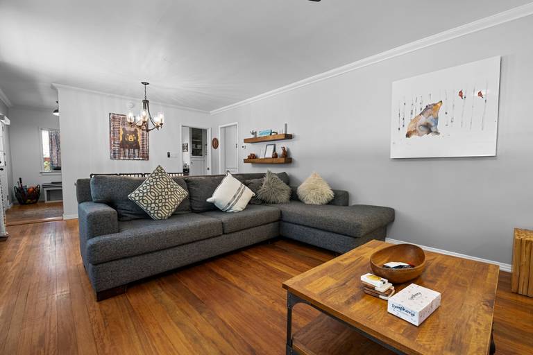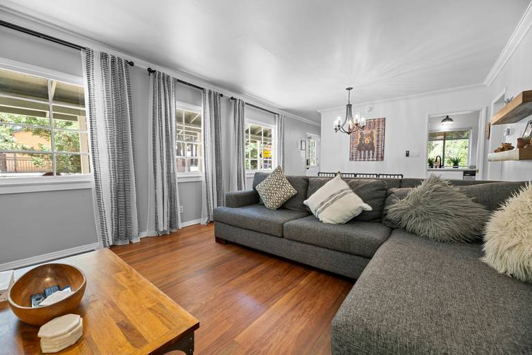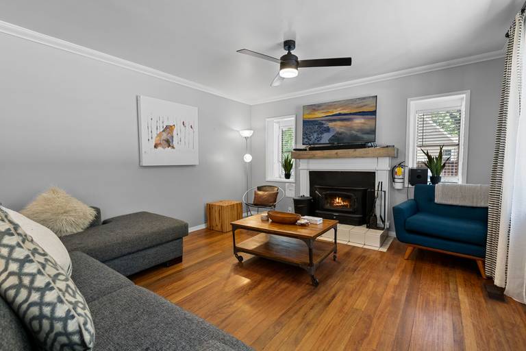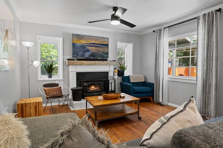 LIVING SPACE - Spacious 1500+ sq ft home with living room, ceiling fan, dining table, beautiful wood burning stove fireplace, and plenty of comfortable living room seating.