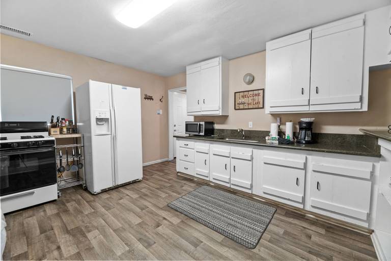 KITCHEN - Granite countertops, stove with oven, double door refrigerator, microwave, blender, toaster, coffee maker, rice cooker, dishes, pots/pans, spices, and more.
