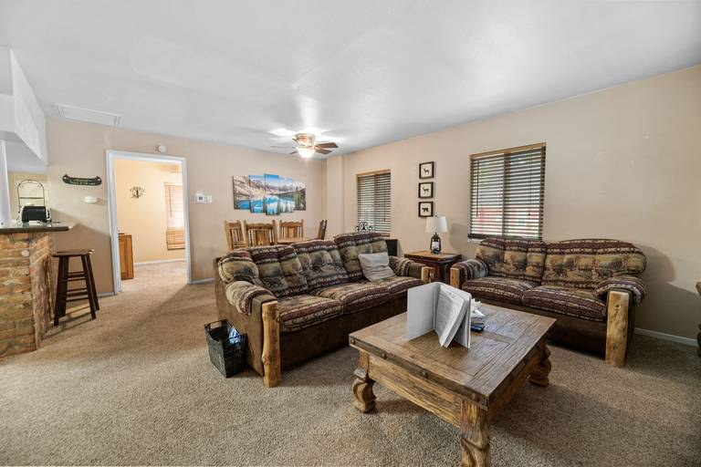 LIVING SPACE - Cozy 900 sq ft home with living room, ceiling fans, dining table, bar seating, a beautiful wood burning fireplace, and plenty of comfortable living room seating.