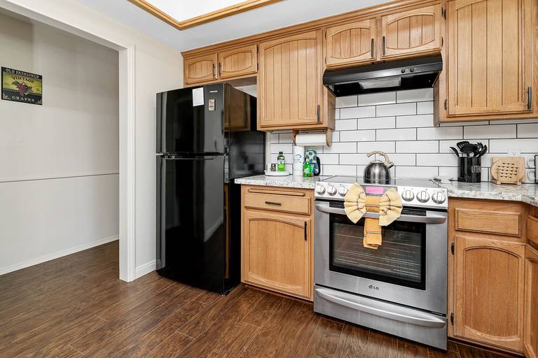 LIVING SPACE - Spacious 1100+ sq ft home with living room, skylights, dining table, bar seating, a beautiful wood burning stove fireplace, and plenty of comfortable living room seating.