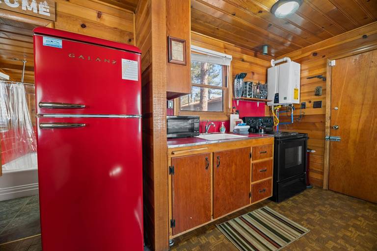 4 of 5The best perk of this cabin (for hikers) is that it's half a mile from the San Bernardino National Forest and the Pine Knot Trail. It's about a mile from Big Bear Village, but it was too hot to walk there. The "full kitchen" has a coffeemaker and coffee, but no sugar or creamer. There is also a toaster, microwave, a few pots/pans, and dishes. Since we stayed a week, we had planned to do some cooking; but the kitchen work space is too limited for major meal prep. It was a very warm week, and only two of the six windows opened. There's no air conditioning; so the cabin heated up during the day, and it was difficult to bring in the cool night air. Kudos to the johnny-on-the-spot maintenance man, who delivered a box fan and discovered the windows had been painted shut. He quickly remedied that, and the rest of the week was much better! We should have reported the problem right away. The cabin decor is rustic, and adds a nice ambience. The bed has plenty of blankets and a heavy comforter for fall/winter visitors, but the mattress is downright hard. The spacious backyard was a joy for the dogs to run and play, despite the absence of grass. (Beware of previous renters who leave junk behind.) There is a propane grill, a large picnic table, and two Adirondack chairs, where we watched the setting sun every evening. All in all, we enjoyed our vacation very much!
