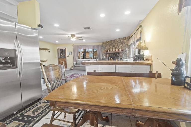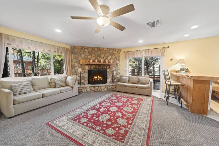 LIVING SPACE - Spacious 1,100+ sq ft home with living room, ceiling fans, dining table, bar seating, a beautiful wood burning rock fireplace, and plenty of comfortable living room seating.