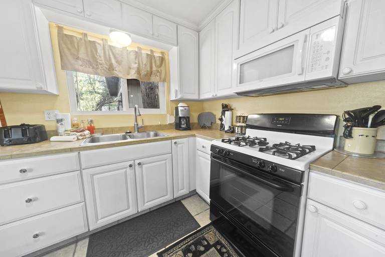 KITCHEN - Full kitchen with stainless steel appliances, stove/oven, double door refrigerator with water and ice dispenser, microwave, blender, toaster, coffee maker, dishes, pots/pans, spices, and more.