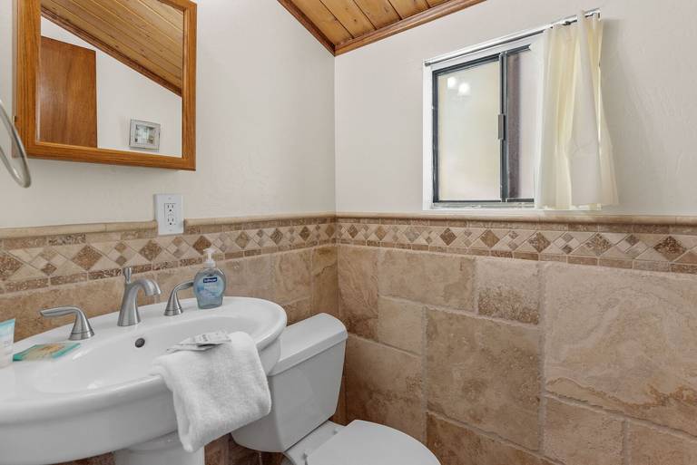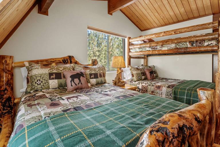 ROOMS & BEDS - 2 bedroom, 1.5 bath. Upstairs first bedroom has a king bed, TV with cable, fireplace, and balcony. Upstairs second bedroom has a double bed and a double/twin bunk bed. Extra blankets and pillows are available.