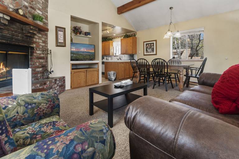 LIVING SPACE - Cozy 700+ sq ft home with living room, dining table, a beautiful wood burning fireplace, and plenty of comfortable living room seating.