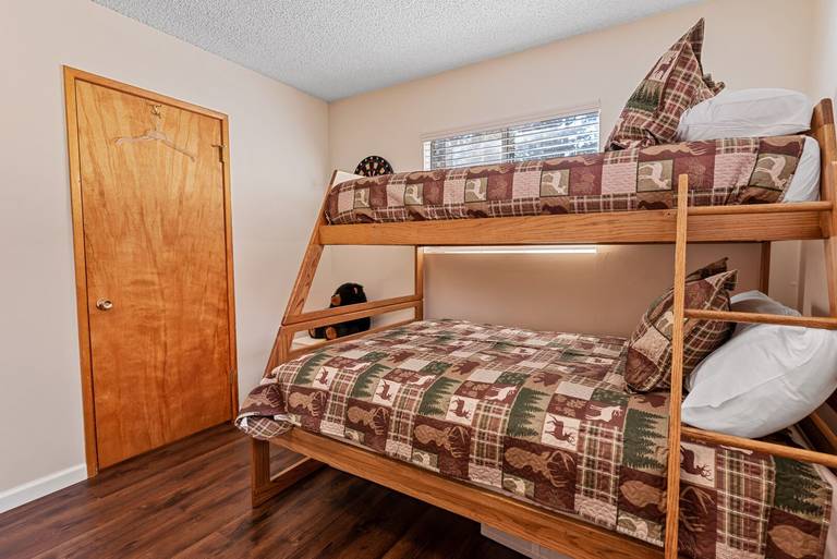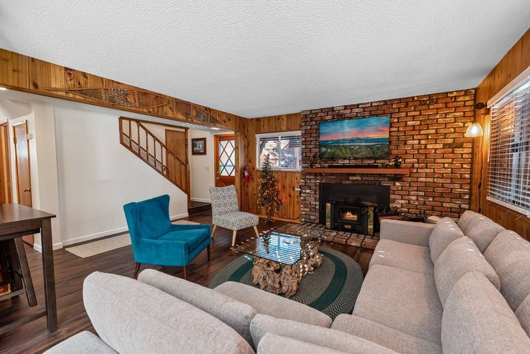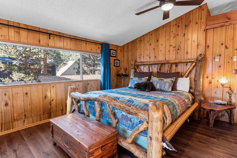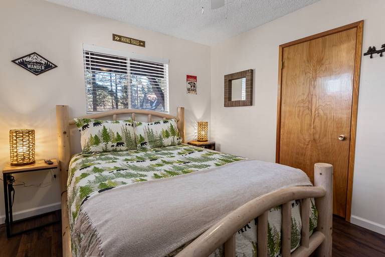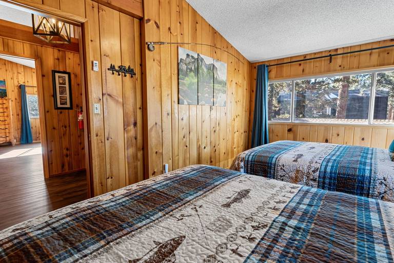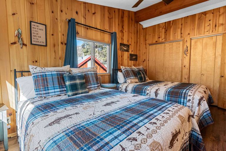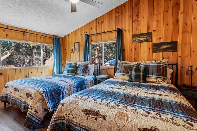 ROOMS & BEDS - 4 bedroom, 2 bath. Upstairs first bedroom is inspired by Bear Mountain Ski Resort and has a king bed and smart TV. Upstairs second bedroom is inspired by Windy Point Fishing Hole and has 2 queen beds. Downstairs third bedroom is inspired by the Pine Knot Trail and has a queen bed and smart TV. Downstairs fourth bedroom is inspired by the Big Bear Alpine Zoo and has a double/twin bunk with trundle and smart TV. Extra blankets and pillows are available.