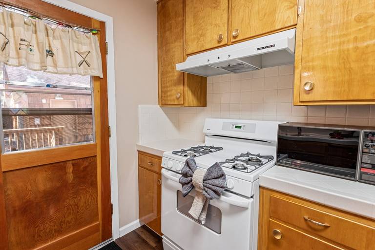 KITCHEN - Full kitchen with stove, oven, refrigerator, microwave, blender, toaster, coffee maker, dishes, pots/pans, spices, and more.