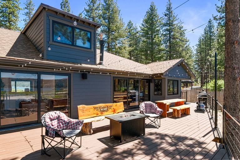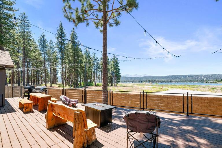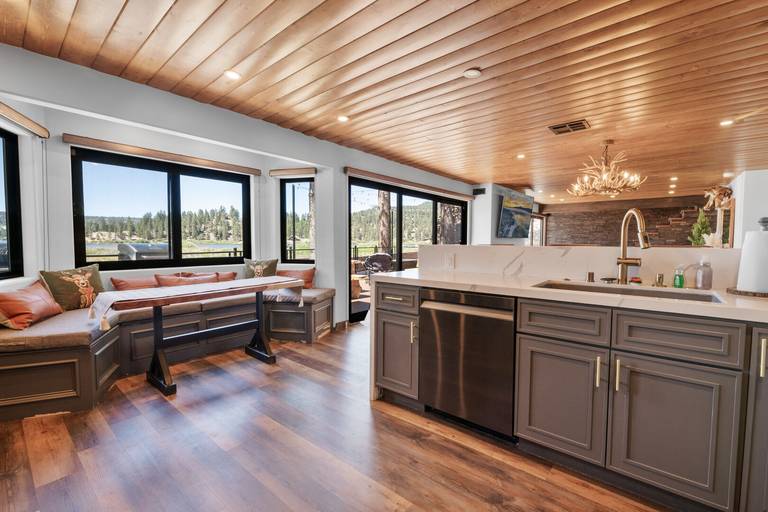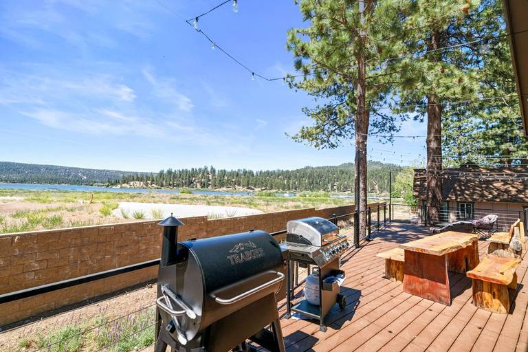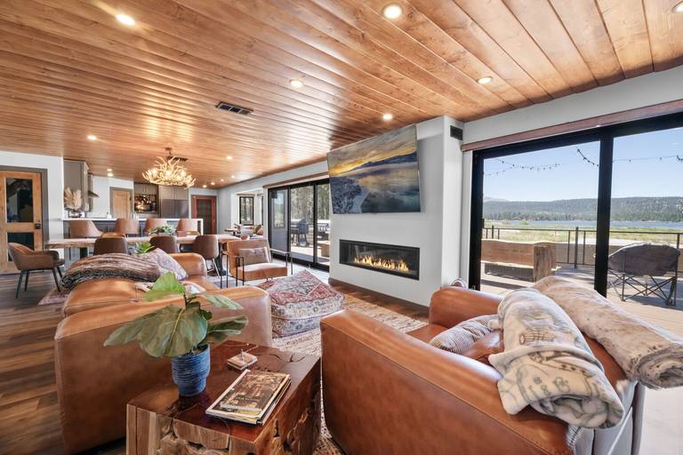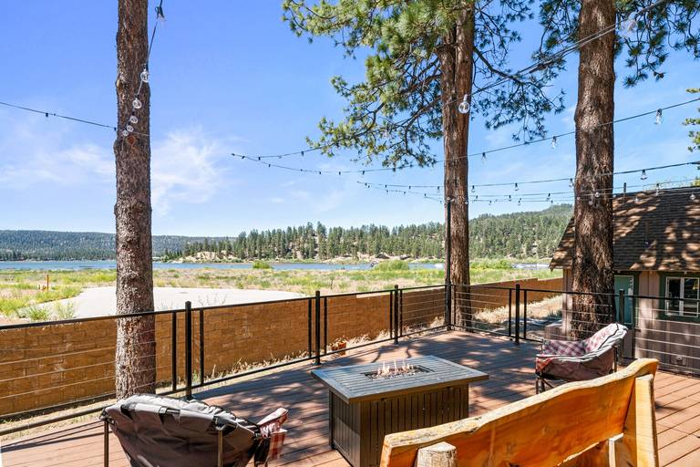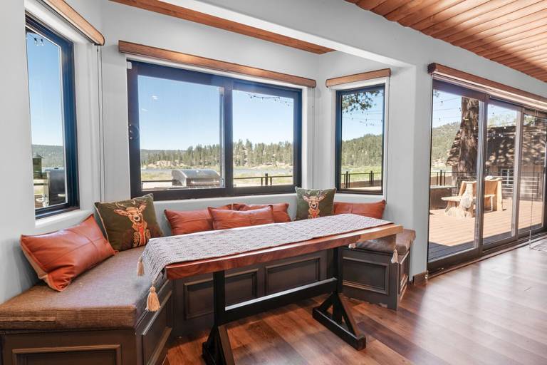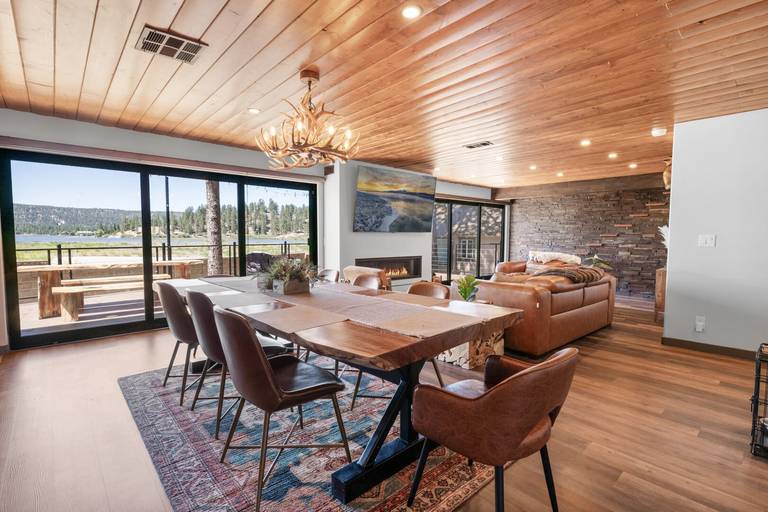 Indulge in breathtaking views of the expansive lake from this charming cabin. The property boasts an open floor plan, setting a warm and inviting tone throughout. The separate living room features a magnificent modern gas fireplace, adding a touch of rustic elegance to the space. A walk-in pantry and a spacious kitchen provide functionality, while the bay window dining area offers a delightful spot to savor meals while gazing out at the picturesque lake. Located in Fawnskin, it is conveniently located away from the heavily trafficked areas but still just a short drive from the Village in Big Bear Lake, local ski resorts, hiking trails, and a short walk to the lake itself.
