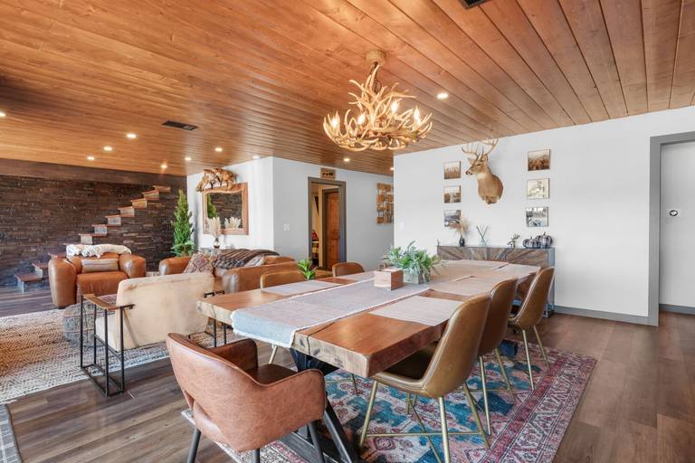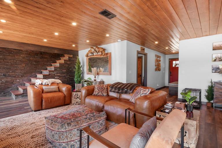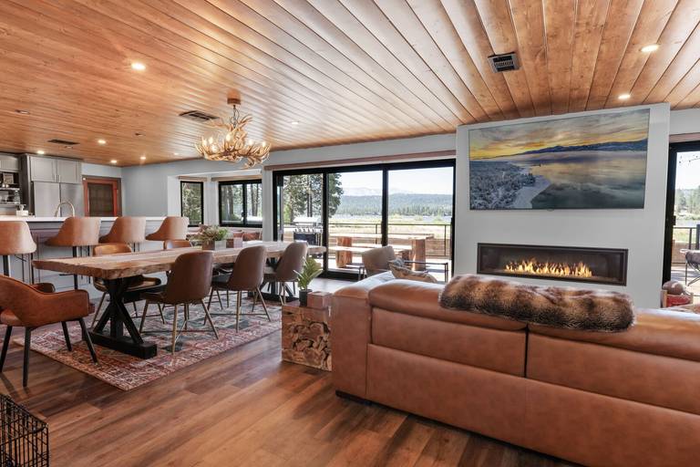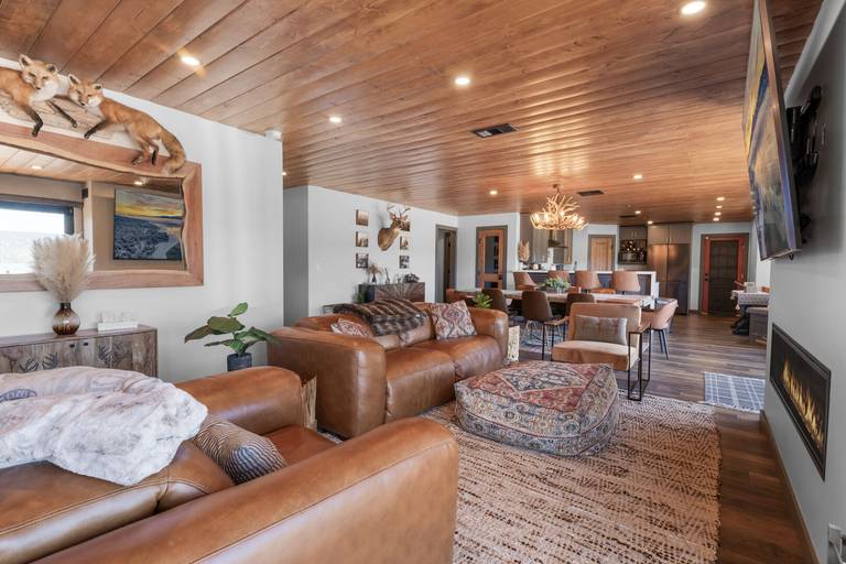 LIVING SPACE - Spacious 2100+ sq ft home with living room, dining table, bar seating, a beautiful modern gas fireplace, and plenty of comfortable living room seating.