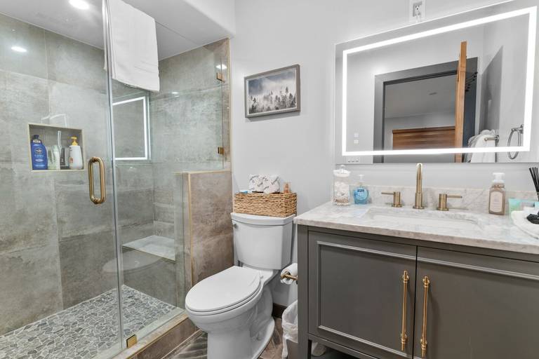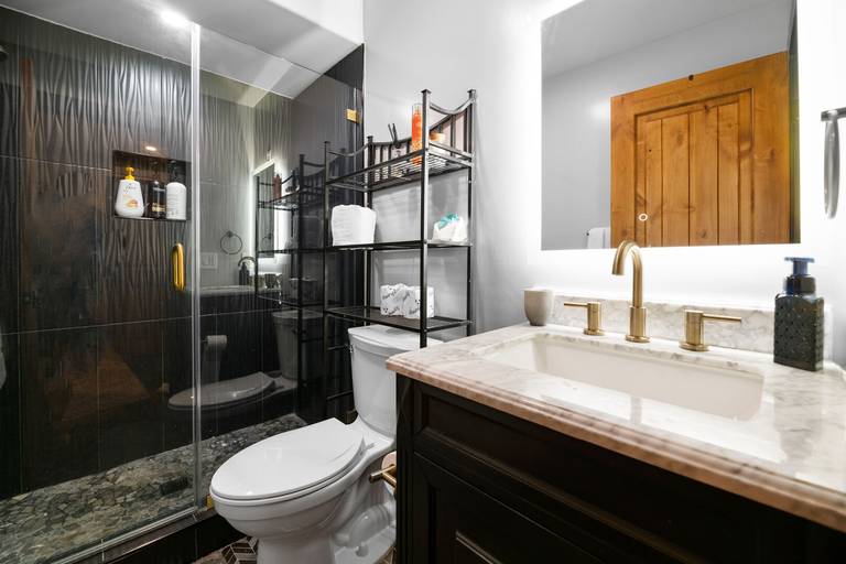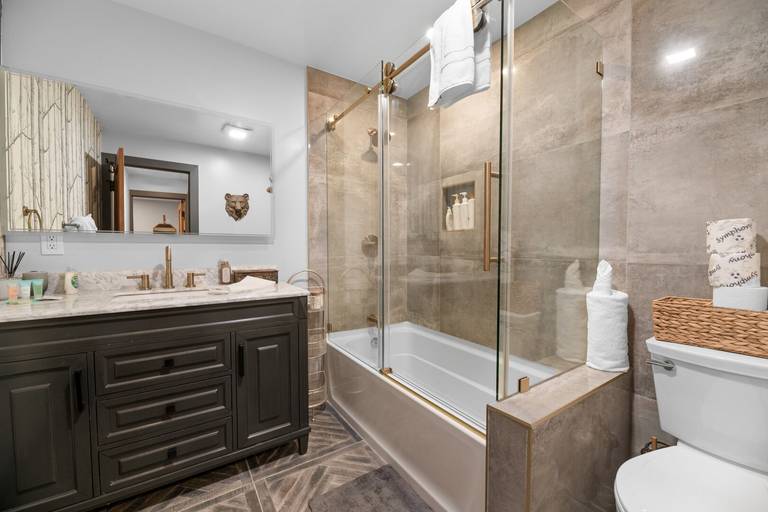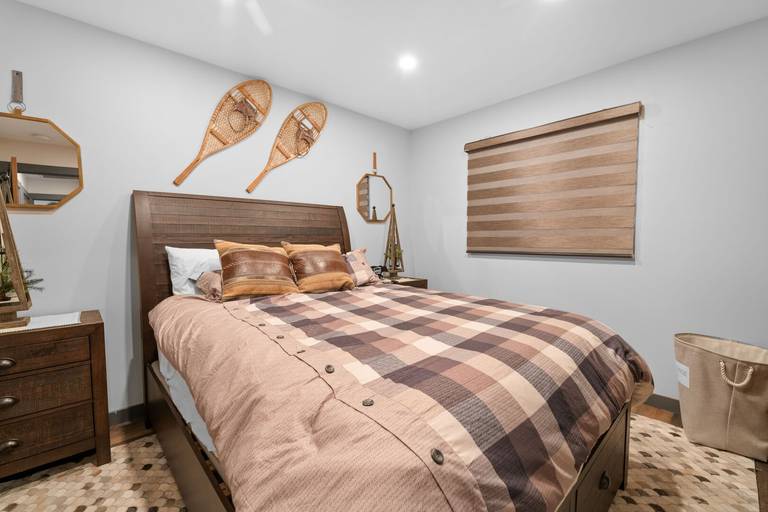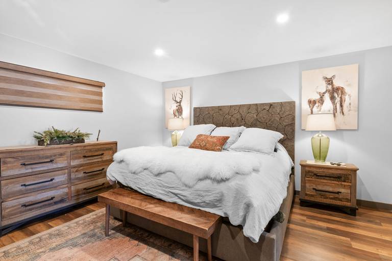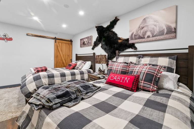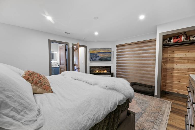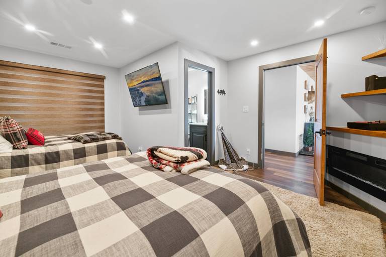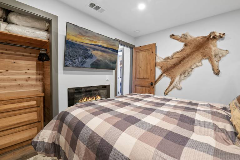 ROOMS & BEDS - 3 bedroom, loft, 3 bath. Downstairs master bedroom has a king bed, TV, electric fireplace, and private bathroom with shower. Downstairs second master bedroom has a queen bed, TV, electric fireplace, and private bathroom. Downstairs third bedroom has two double beds, TV, electric fireplace, private bathroom with shower, and deck. Extra blankets and pillows are available.