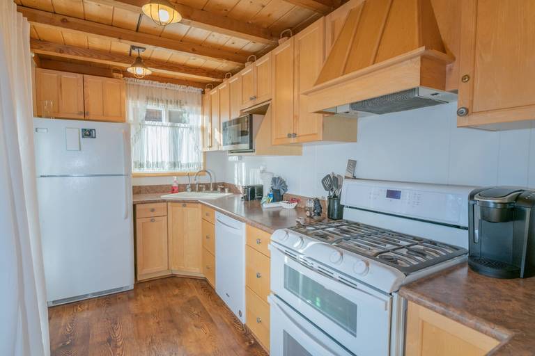 KITCHEN - Full kitchen with stove, oven, refrigerator, dishwasher, microwave, blender, toaster, coffee maker, dishes, pots/pans, and more.