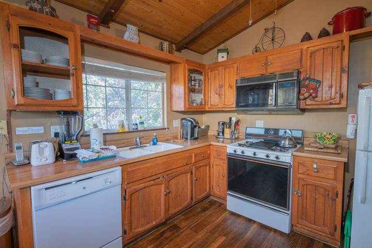 KITCHEN - Full kitchen with stove/oven, refrigerator, dishwasher, microwave, blender, toaster, coffee maker, rice cooker, dishes, pots/pans, spices, and more.